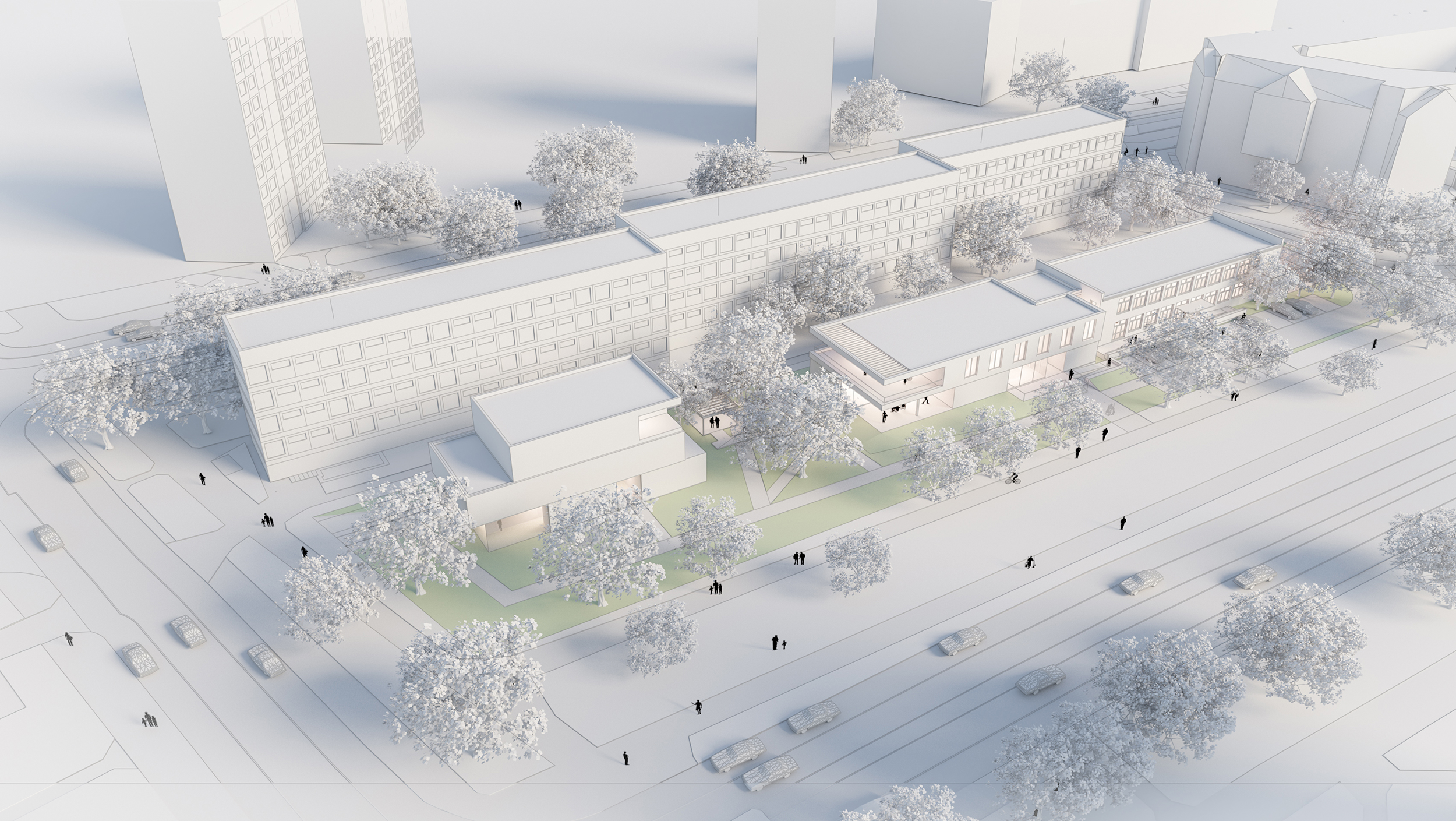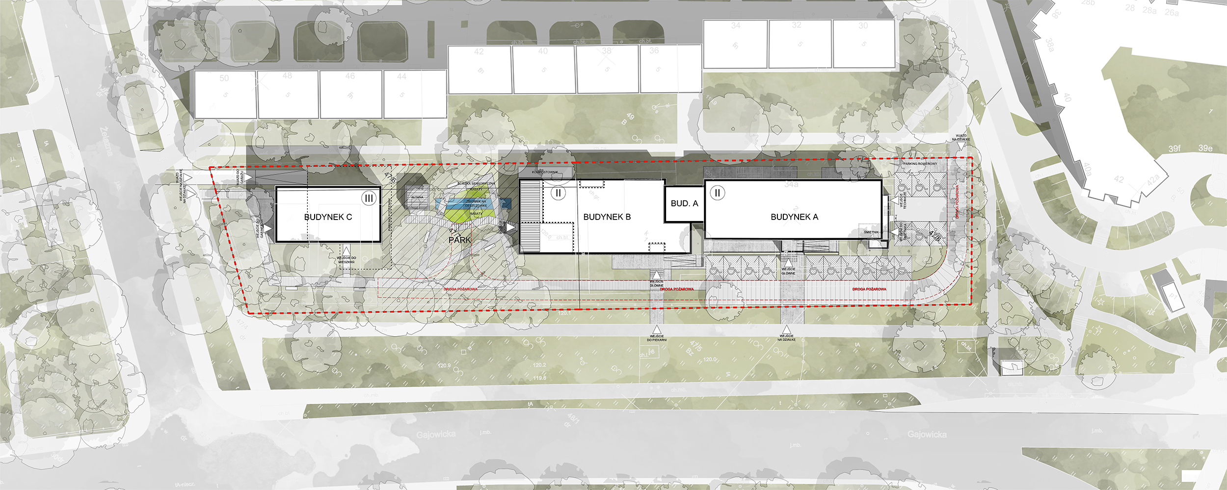 Układ obiektu oparto na czytelnej strukturze trzech budynków, połączonych wspólną osią zieleni – parkiem pełniącym rolę serca całego założenia. Wnętrza otwierają się na otoczenie poprzez duże przeszklenia i tarasy, co pozwala mieszkańcom na kontakt z naturą i światłem dziennym. W architekturze wykorzystano proste formy i naturalne materiały, które nadają całości spokój i elegancję, a zarazem budują atmosferę ciepła i domowości.